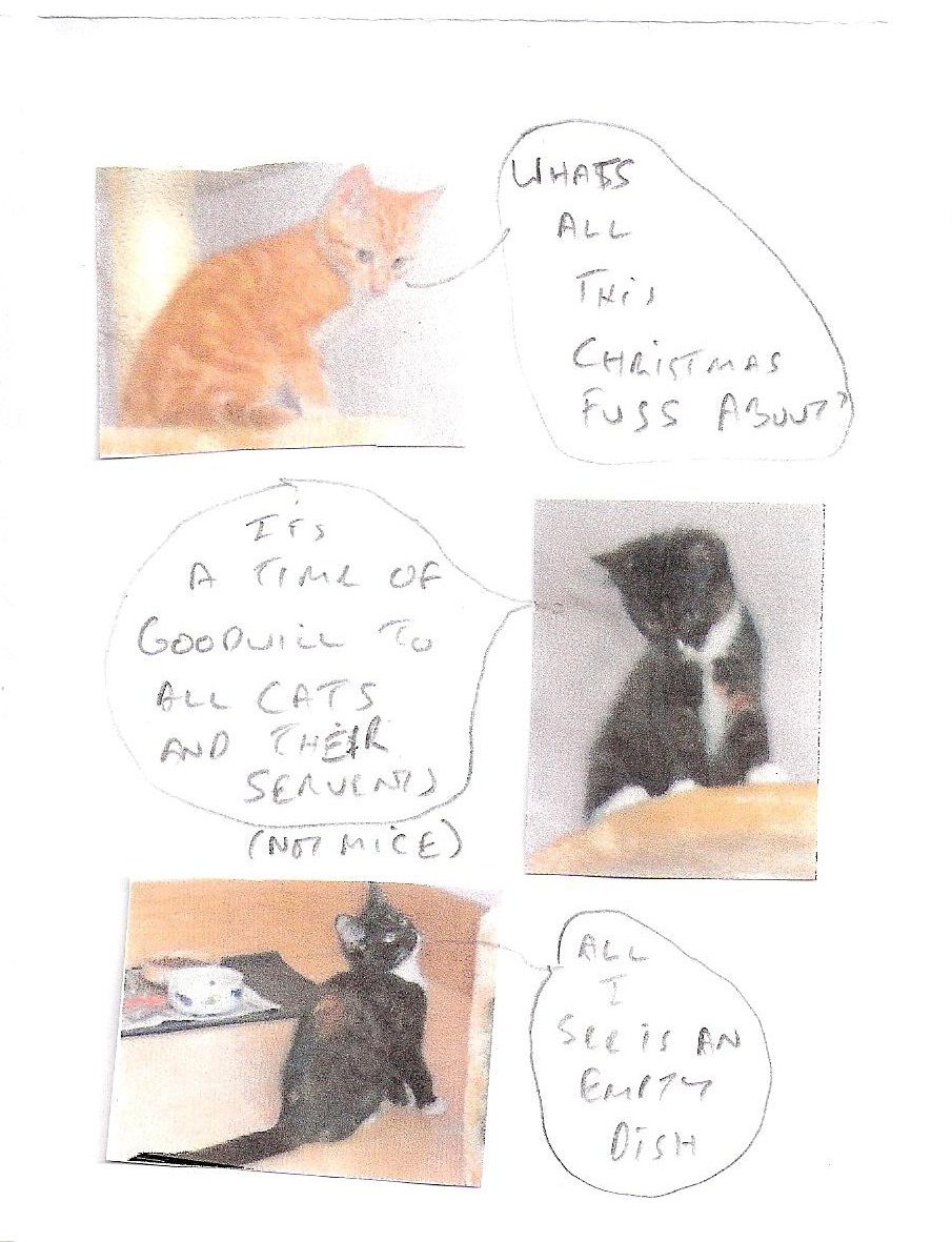 Rufus caught a bird yesterday and we found it rather messily dead on the kitchen floor. But to make up for it, I got a lovely card from the cats today.